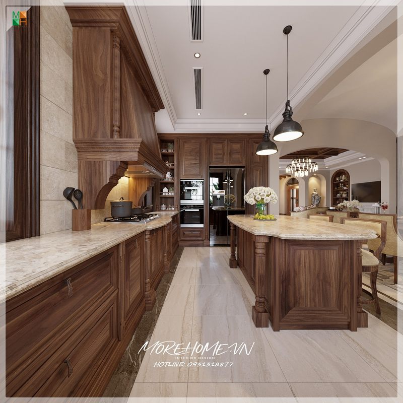 Tủ bếp gỗ óc chó mặt đá tân cổ điển cung cấp sự hỗ trợ hữu ích cho việc sử dụng nấu nướng của gia chủ.