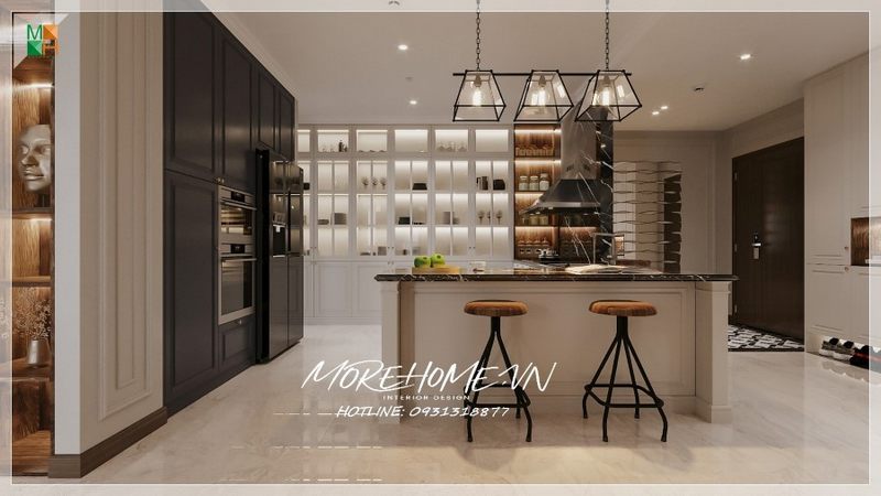 Thiết kế nội thất phòng bếp biệt thự hiện đại, tinh tế với tone màu trắng và tiện nghi cho người nội trợ